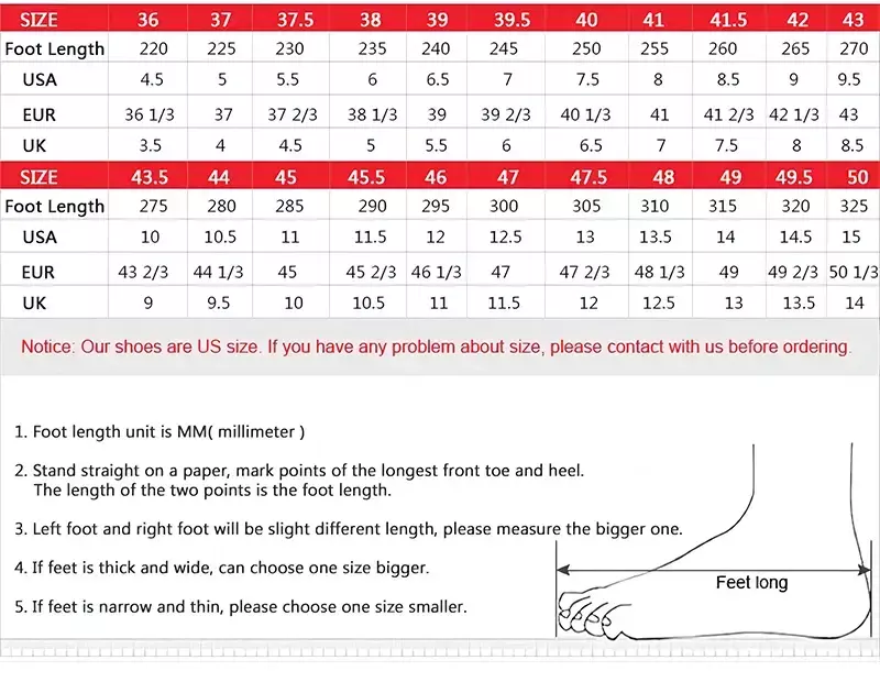 1.Escolha o tamanho de acordo com o seucomprimento do pé, geralmente ocomprimento da palmilhaestá por perto0,5-1 cm maisdo que o comprimento do pé;