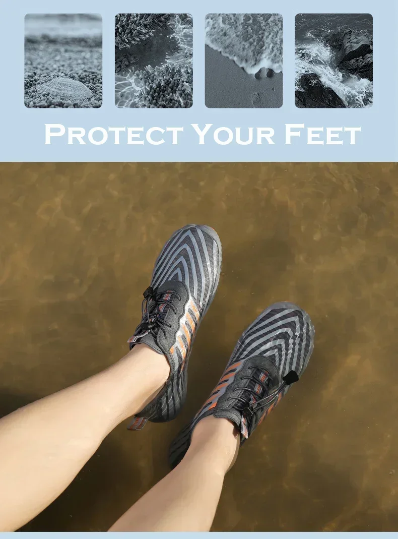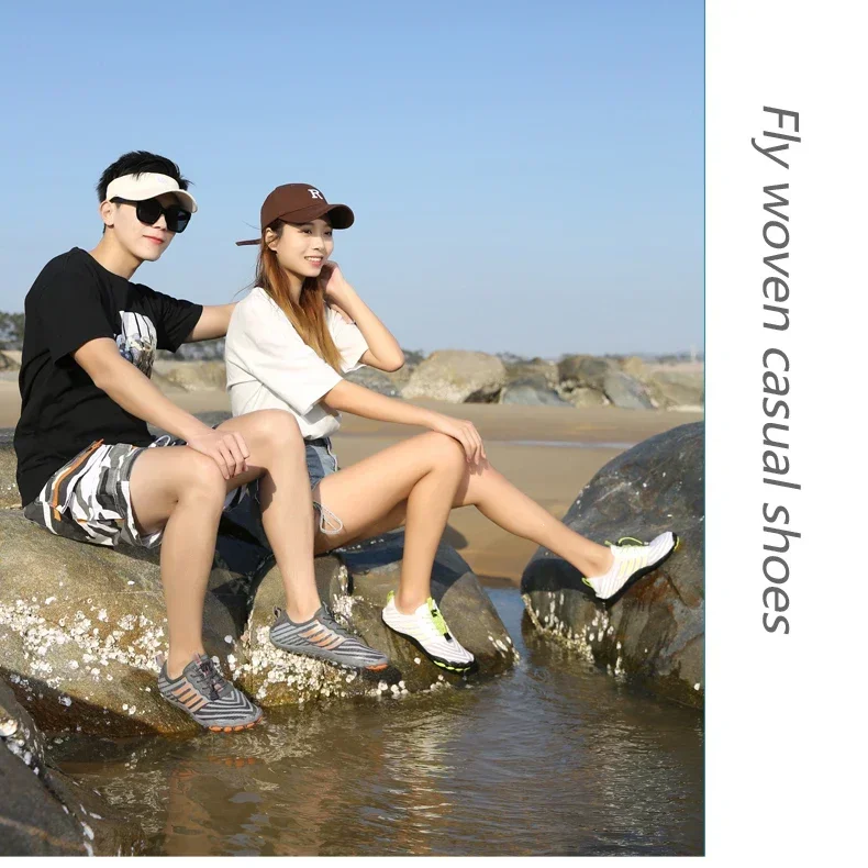 Respirável e de secagem rápida:As partes superiores dos sapatos aquáticos são feitas de tecido de malha elástico e respirável para flexibilidade e conforto.A água pode fluir rapidamente, tornando o ambiente do calçado mais fresco, seco e saudável.