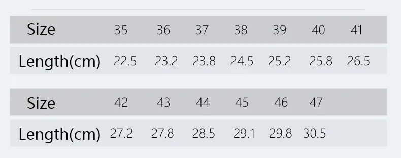 1. as medidas são o tamanho máximo,permita um erro de cerca de ± 5MMCompare cuidadosamente a tabela de tamanhos com o comprimento dos pés antes de fazer o pedido.
